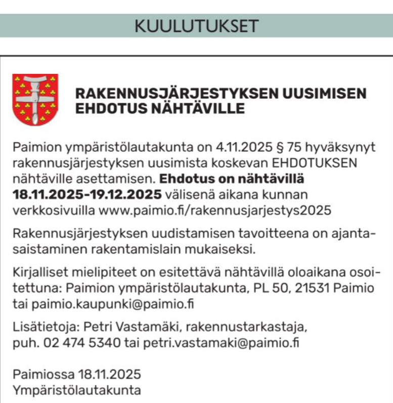 Rakennusvalvonnan tehtävänä on valvoa rakennustoimintaa Paimion kaupungissa.