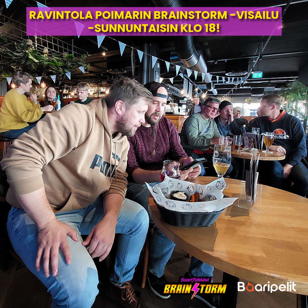 Jos joukkueesi ei ole ennen yltänyt palkintosijoille perinteisessä Baaripähkinässä, nyt on tilaisuutenne loistaa. Brainstormissa ei tarvitse olla kävelevä tietosanakirja – kuka tahansa voi nousta kärkeen, ja joskus pienikin tuuri ratkaisee voiton!