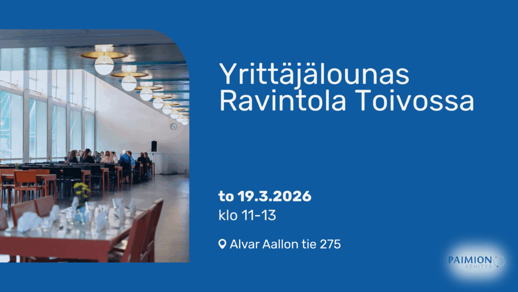 Tule mukaan verkostoitumaan ja tapaamaan muita yrittäjiä Paimion Kehitys Oy:n järjestämälle lounaalle ja anna samalla panoksesi Paimion kaupungin strategiatyöhön. Tavattavissa Paimion kaupunginjohtaja, elinkeinojohtaja ja Paimion Yrittäjät ry:n hallituksen puheenjohtaja.