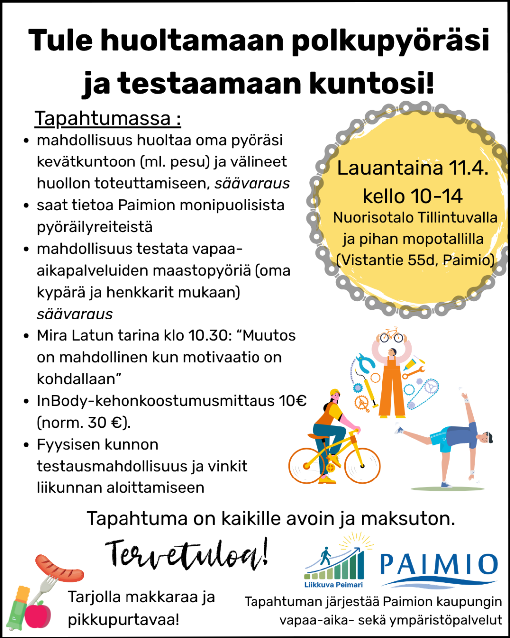 Tapahtumassa yhdistyy hyvinvointi, liikunnan ilo ja käytännöllinen hyöty! Tule huollattamaan polkupyöräsi kesäkuntoon ja nappaa samalla itsellesi hetki oman kehon tarkasteluun.
