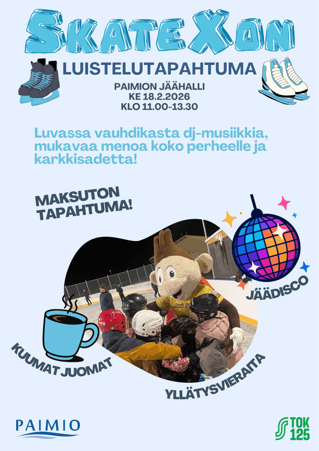 Maksuton luistelutapahtuma, jossa non-stop ohjelmaa sekä jäädisco. Tarjolla karkkisadetta, kuumaa juomaa ja yllätysvieraita.