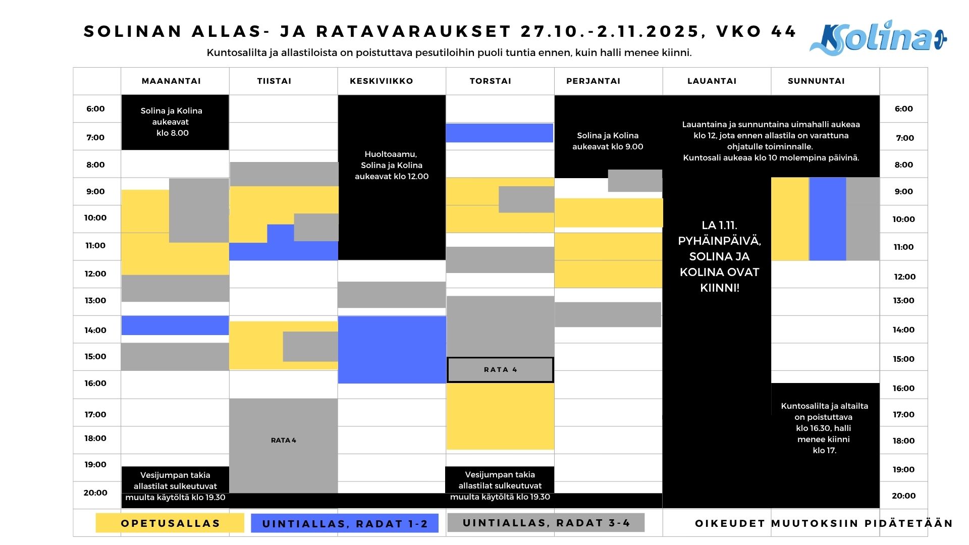 Viikoittaiset varaukset esitellään tälle sivulle päivitettävillä kuvatiedostoilla, joista selviää tarkat kellonajat ja varausten kohteena olevat radat ja/tai altaat. Tällä tavoin voit välttää ruuhka-aikoja.