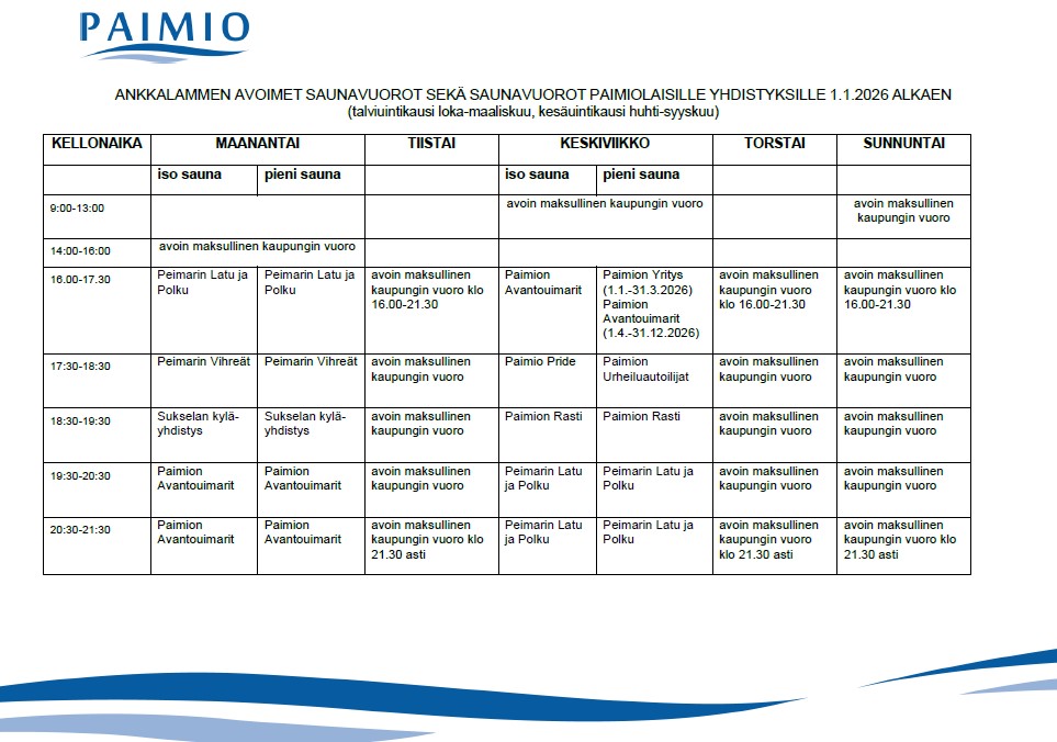 Liikuntapalvelut myöntävät paimiolaisille järjestöille varattavat maksulliset vuorot maanantai- ja keskiviikkoilloille. Vuorot haetaan sähköisillä lomakkeilla, hakuaika alkuvuodesta. Vuoroja voidaan hakea 1-2 tunnin mittaisiksi/ ilta ja käytössä on 1-2 saunaa järjestön tarpeen mukaan. Vuoroja voi hakea talvi (loka-maaliskuu)- tai kesäkaudeksi( huhti-syyskuu) tai koko vuodeksi. Järjestöjen vuorot ovat myös maksullisia ja ne laskutetaan seuralta kauden päätteeksi.